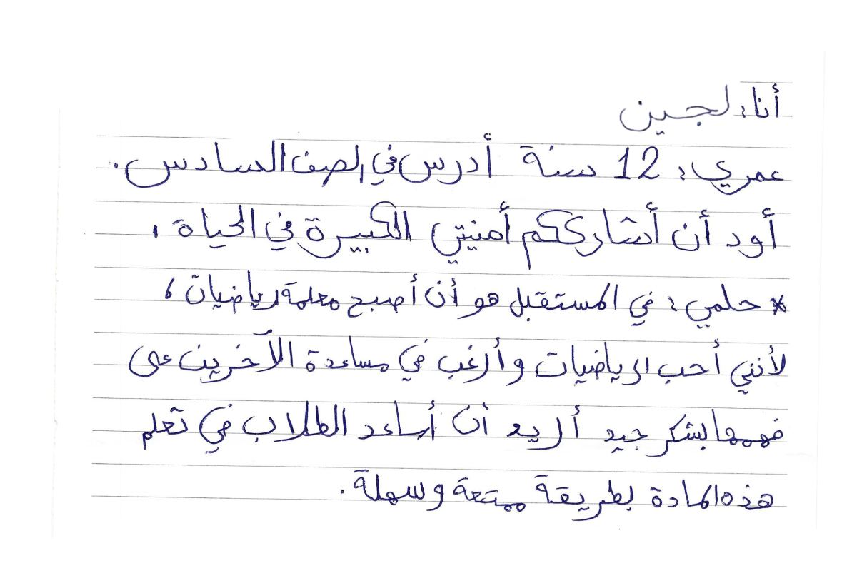 واليوم، تتحدث لُجين عن حلمها بابتسامة: تريد أن تصبح معلّمة رياضيات. تحب هذه المادة، وتؤمن أنها ليست صعبة كما يعتقد البعض، بل يمكن أن تكون ممتعة وقريبة من الأطفال. تقول إنها تريد أن تدرّس الرياضيات بطريقة تجعل الأطفال يحبّونها و لا يخافون منها.